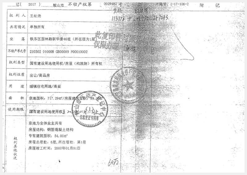 地址:鞍山市鐵東區(qū)園林路新華委46組 標(biāo)的號:225-3