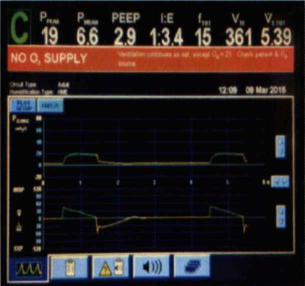 當呼吸機主顯示界面報NO O? SUPPLY,查看報警后提示:Ventilation continues as set. Except O2=21. Check patient & O? source,此時考慮呼吸機氧氣氣源連接是否順暢,也可能是氧氣氣源壓力不夠導致。
