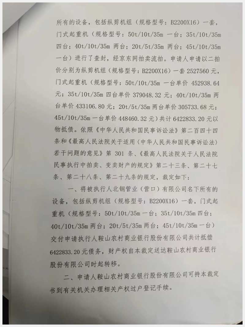 101號 北鋼管業(yè)(營口)有限公司所屬的機器設備